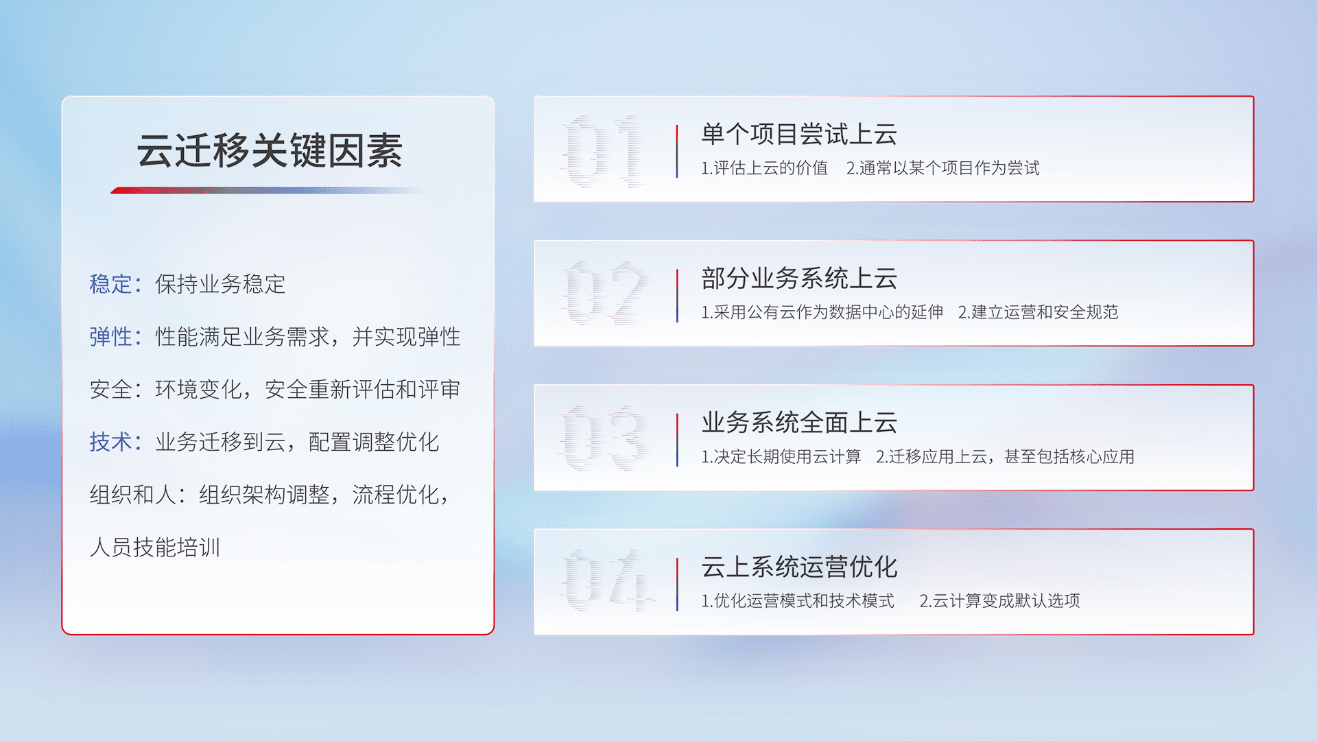 结合实际业务,,从规划设计、、、、云平台选型、、、、云原生改造、、、、数据迁移、、、、集成交付,,迁移全过程为客户识别最佳上云路径,,,做好风险识别管理,,,设计网络架构、、身份权限、、安全审计合规、、操作审计、、、日志审计、、、监控告警策略、、多站点容灾设计等,,,,对云上基础设施进行整体规划,,,提升IT治理水平,,,以满足弹性、、、高可用、、高性能的需求。。。